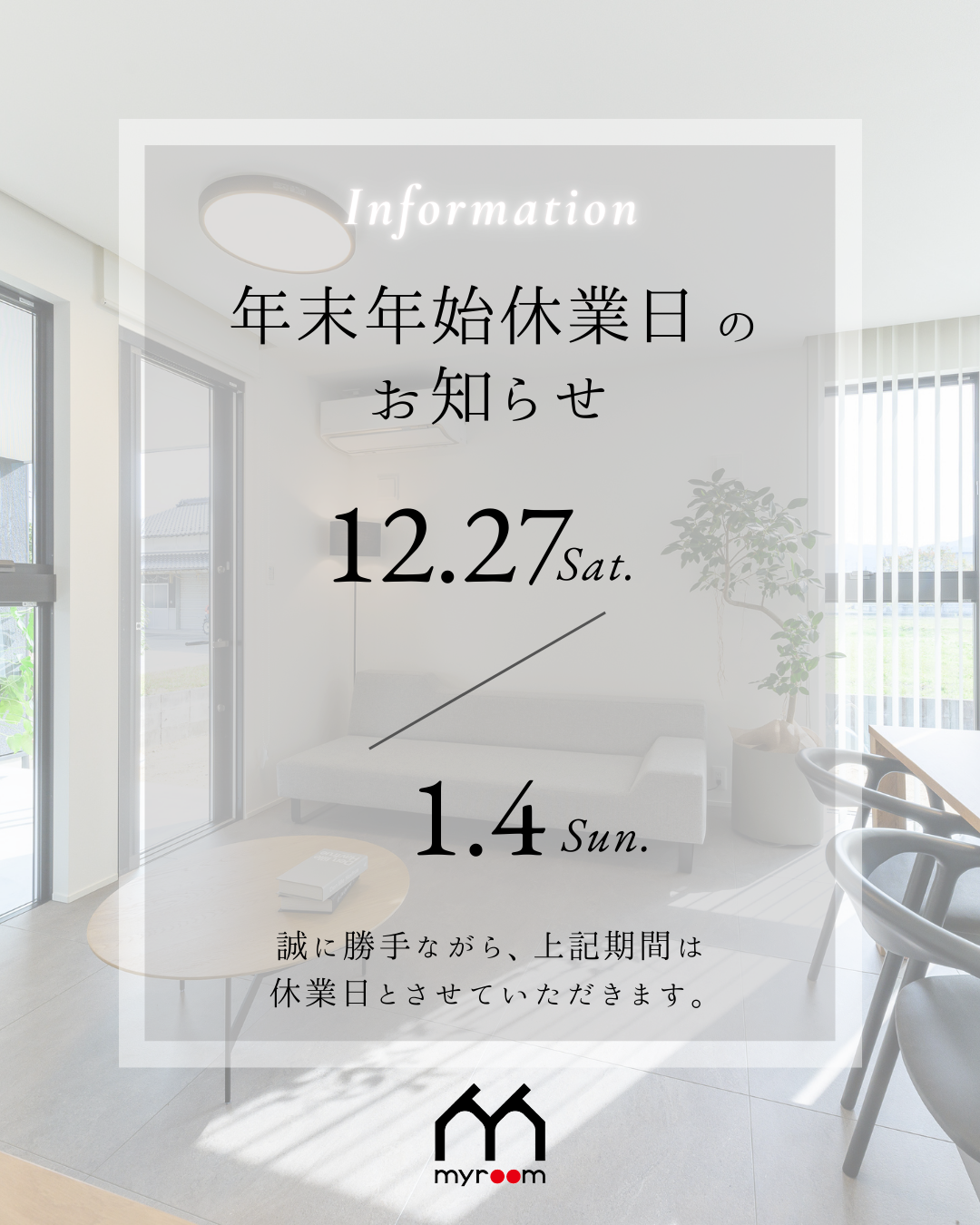 12月27日(土)〜1月4日(日)まで休業日とさせていただきます。