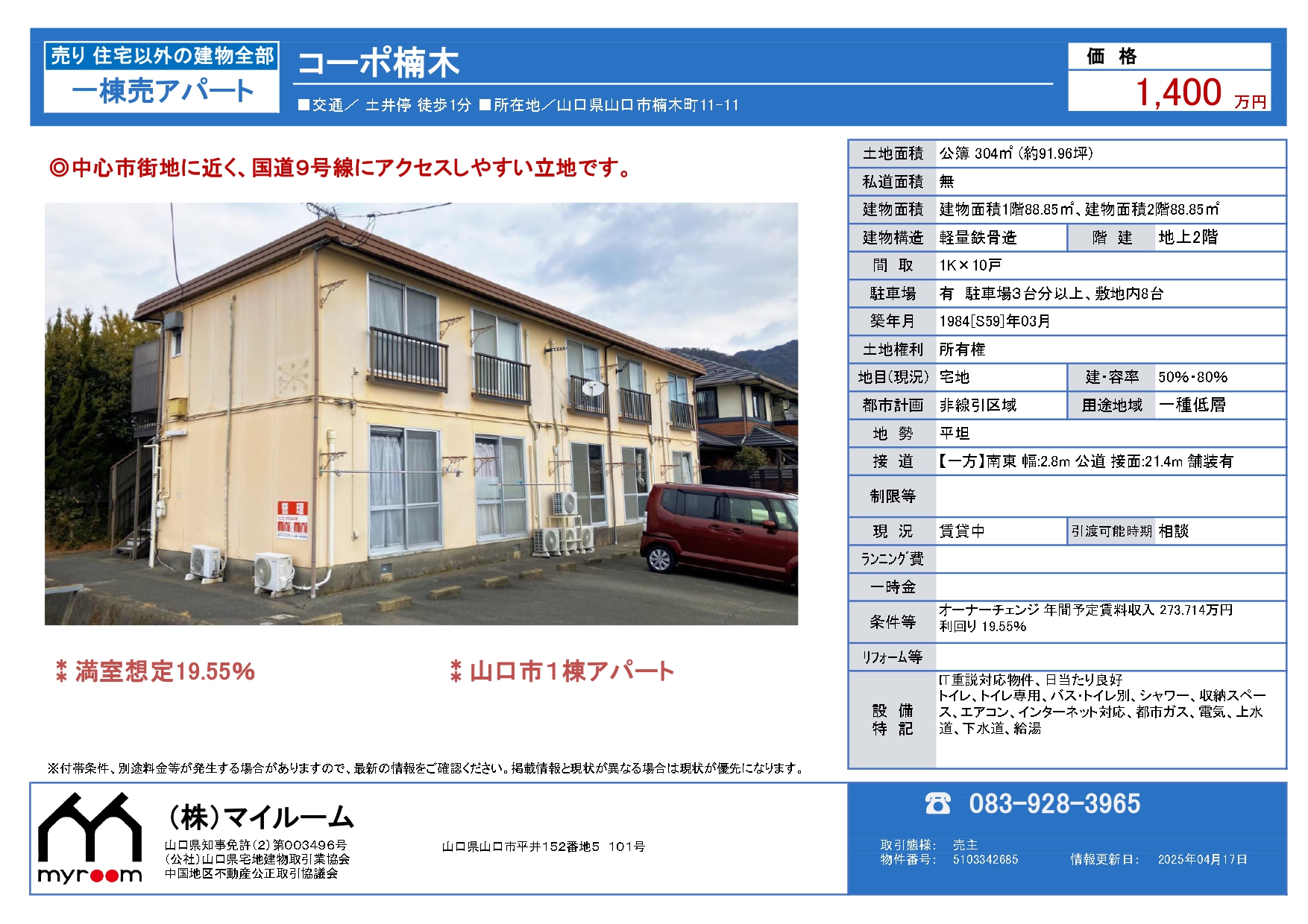 | 物件名 | 山口市楠木町|コーポ楠木1K×10世帯【賃貸アパート】 |