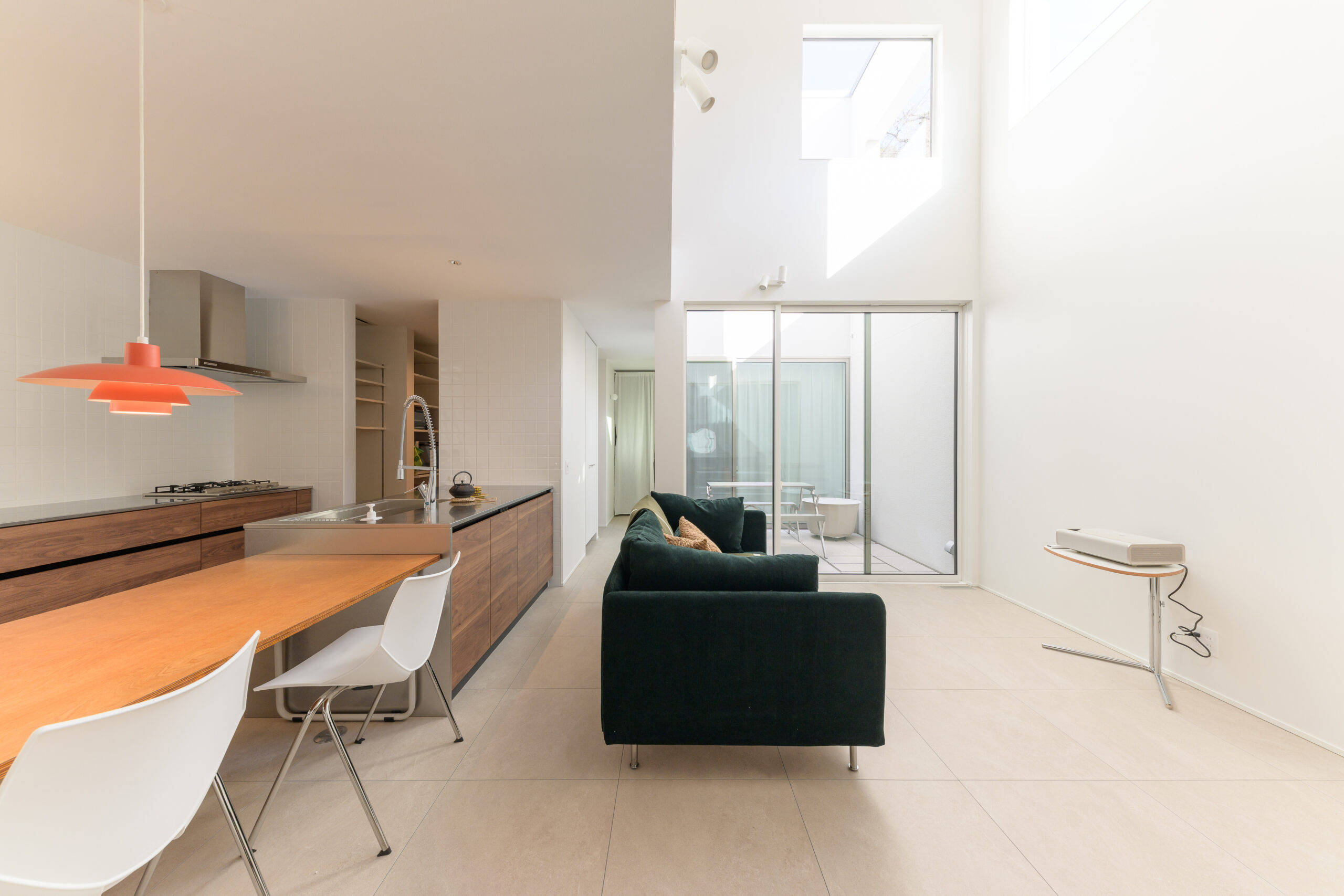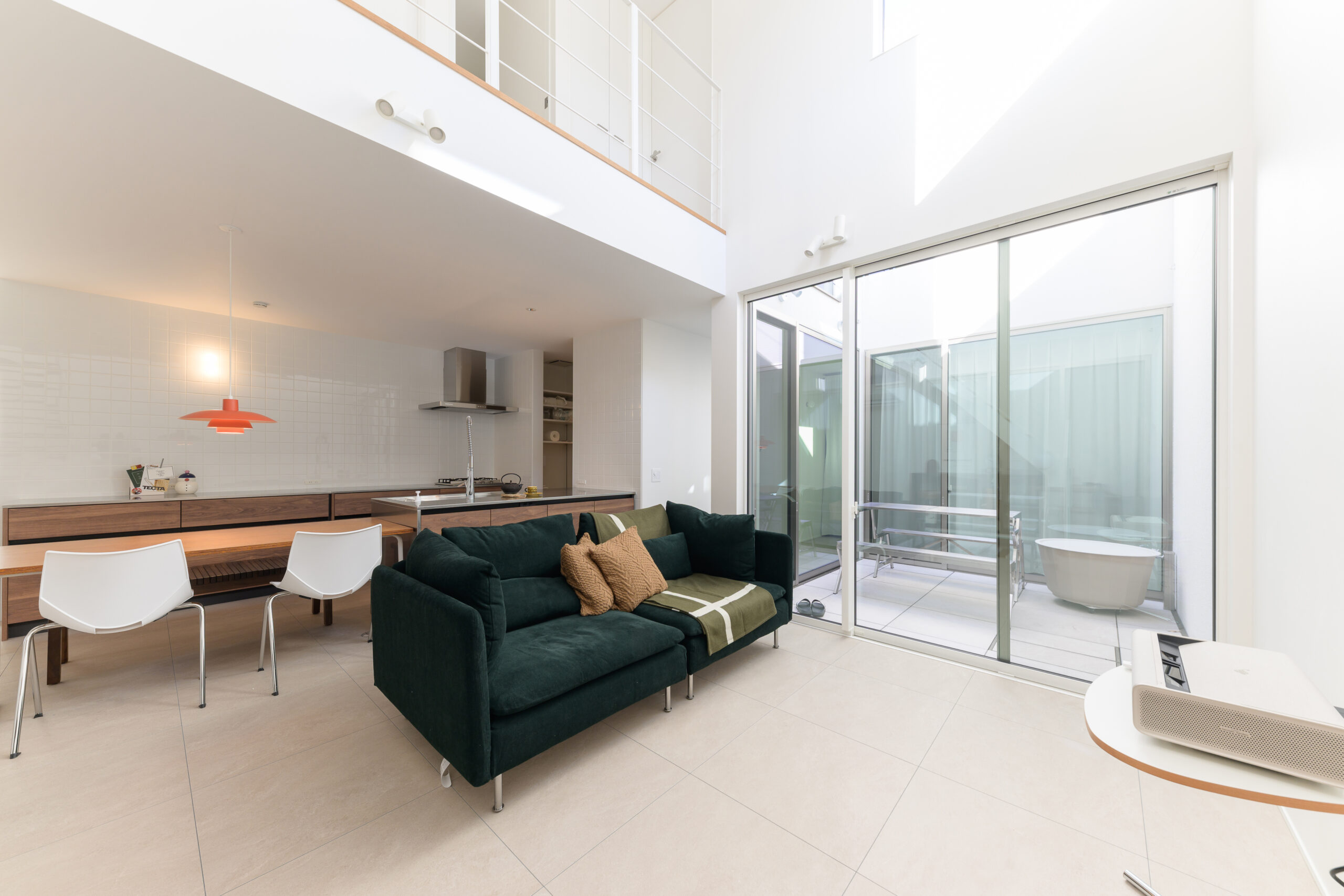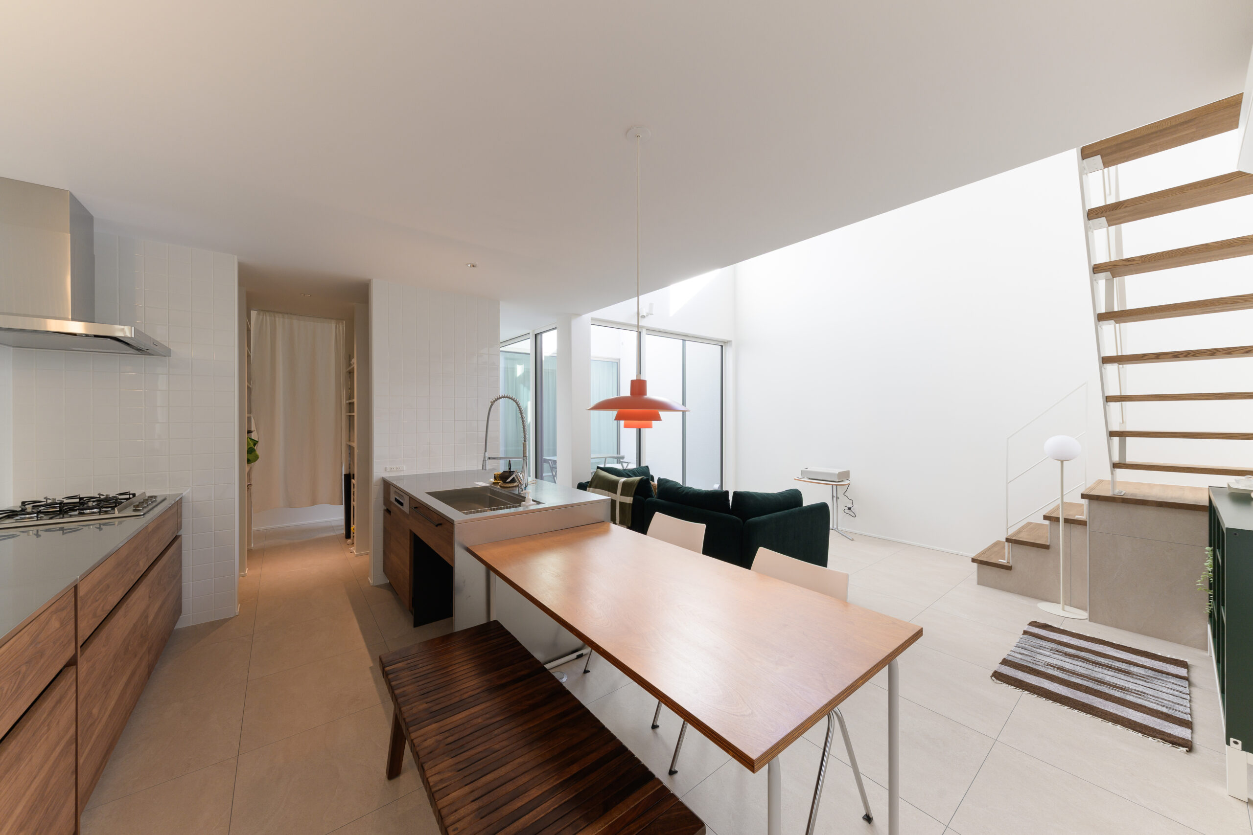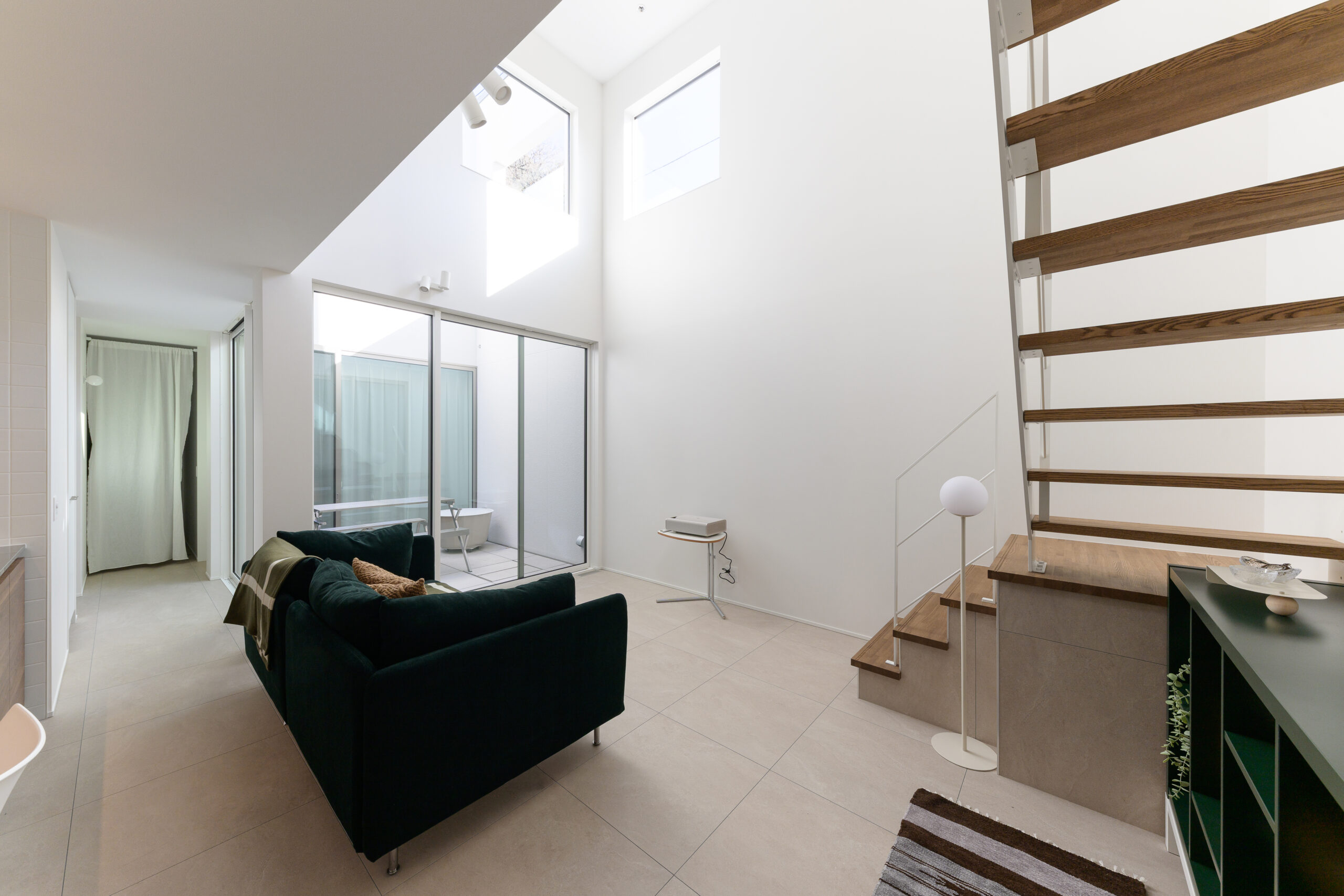 家の中心に中庭のある間取りです。 リビングや寝室、2階の廊下からも空を見上げることができ、屋内と屋外の境界線をなくしました。 夜には星空を眺めながらリラックスタイム。 中庭は外からは見えない構造となっており、カーテンなしでもプライバシーが守られる設計です。